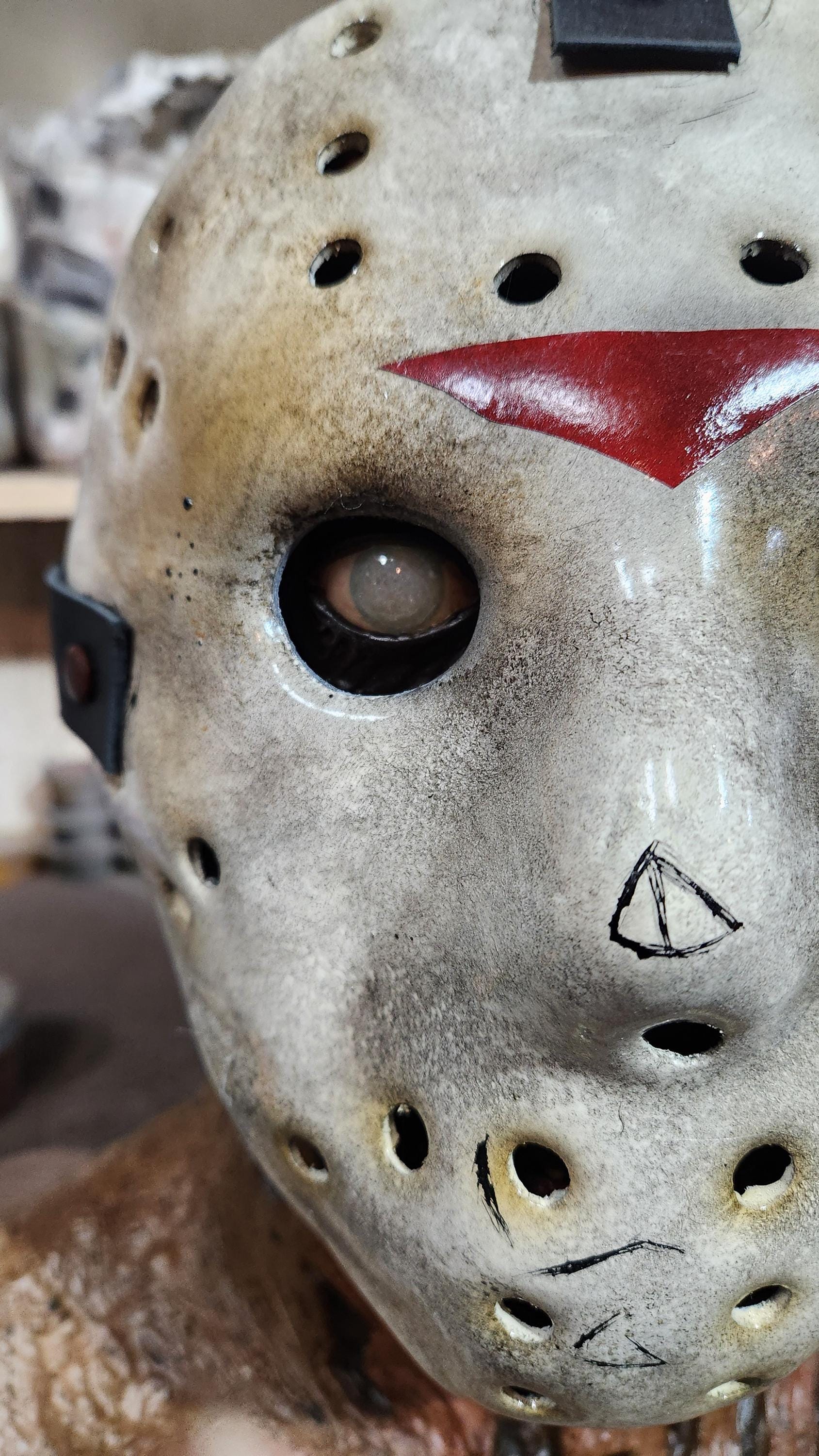 This Drowned Revenant display mask + hockey mask features a custom-made acrylic eye and genuine leather straps and screen accurate hardware. The display mask is latex with a polyurethane and epoxy eyeball, and the hockey mask is thermoformed polystyrene. Straps are black leather with weathered paper fasteners and window screen in the dead eye.