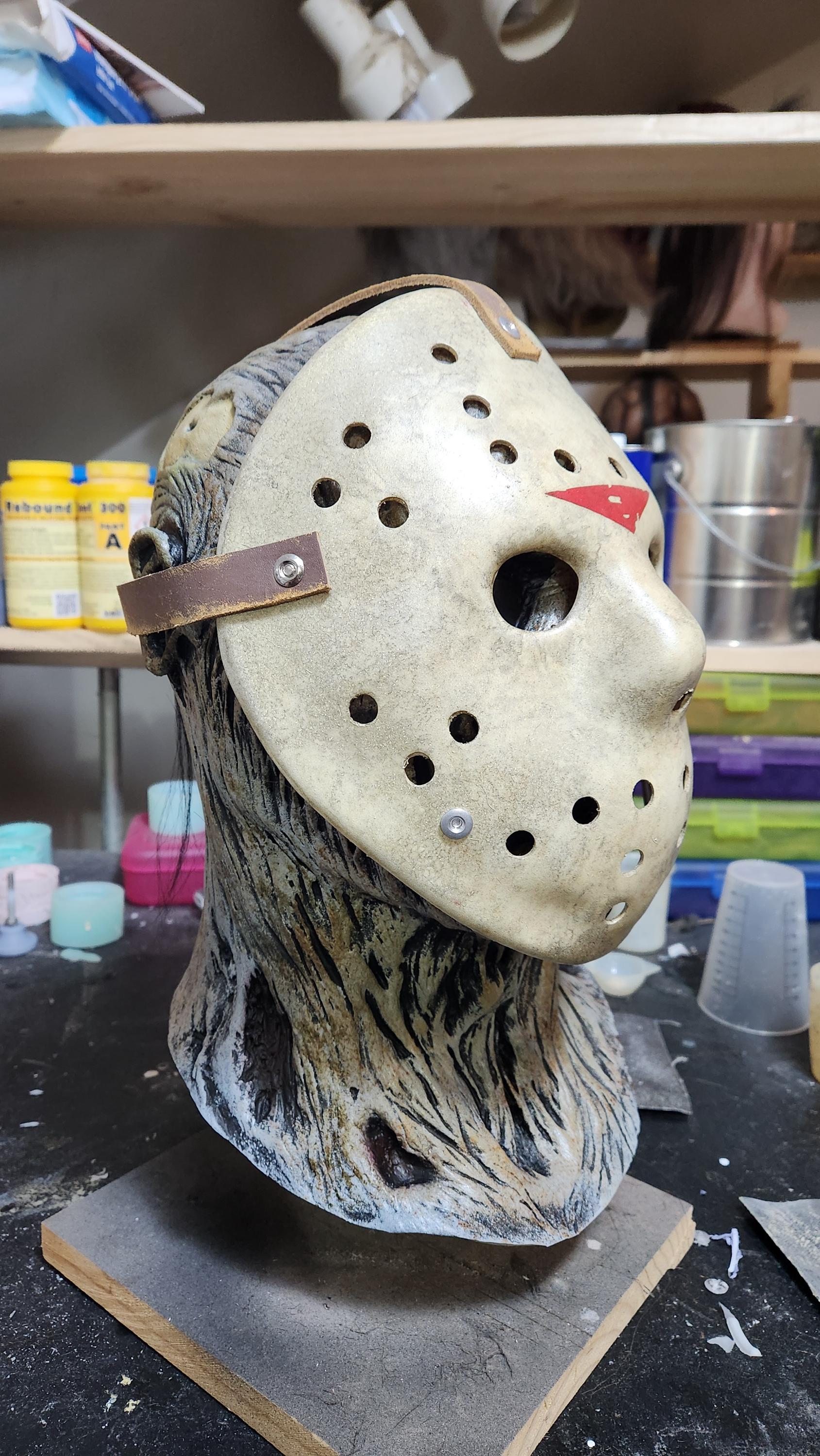 Resurrected Hood + Killer Goalie Mask. The display mask is latex and the hockey mask is a re-hauled Trick or Treat Studios Killer Goalie Mask.. Straps are black elastic and aluminum rivet-style binding post screws.